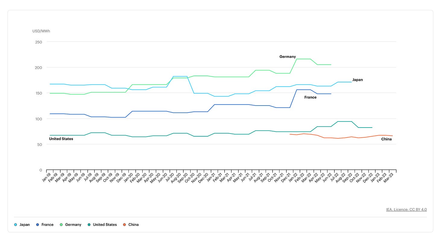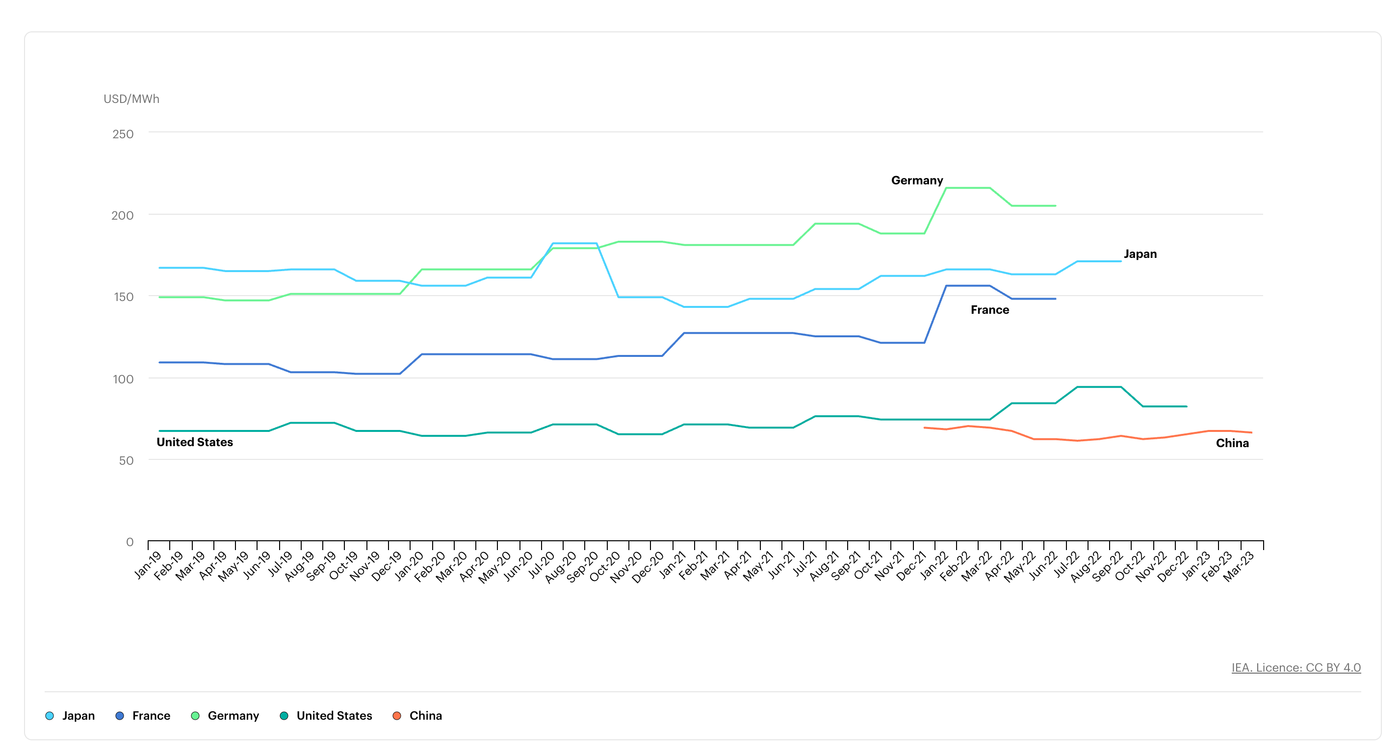 Industry end-user prices for electricity in selected countries, 2019-March 2023
